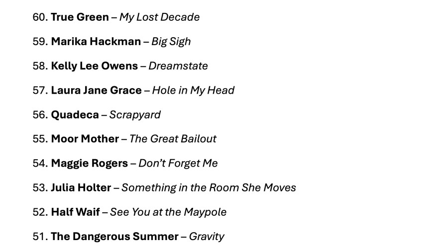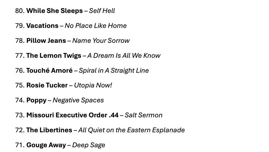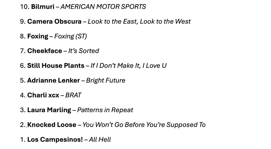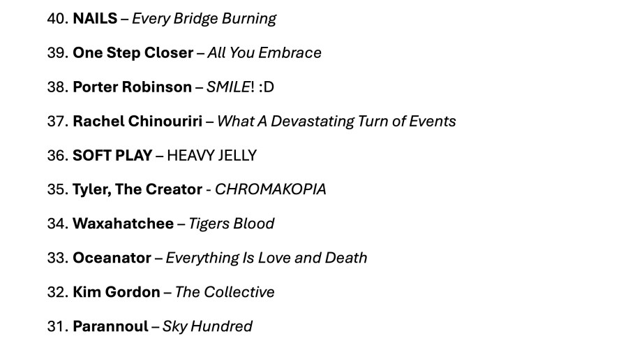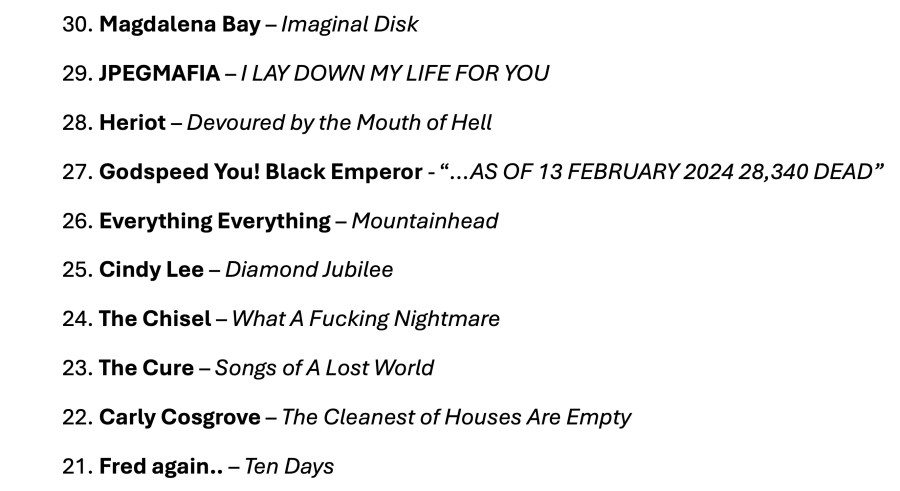 I was having a pretty good 2024. I say ‘was having,’ because thirty minutes ago I sat down to write this post, and it’s taken me the full half hour just to get this page to load. Thanks for ruining my year, WordPress; it’s your fault this list looks the way it does – no photos, no links, no info about each album. I’m getting old, man, you’ve got to make things a little easier for me. I don’t have the patience I did back in 2012.